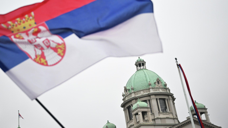Флаг Сербии. Архивное фото Студенты провели массовое шествие по центру Белграда, они прошли к крупнейшему в регионе православному…