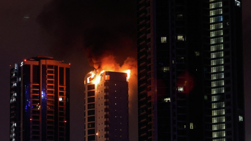 Пожар на месте удара по зданию в Манаме, Бахрейн Три жилых здания повреждены в Бахрейне в результате падения…