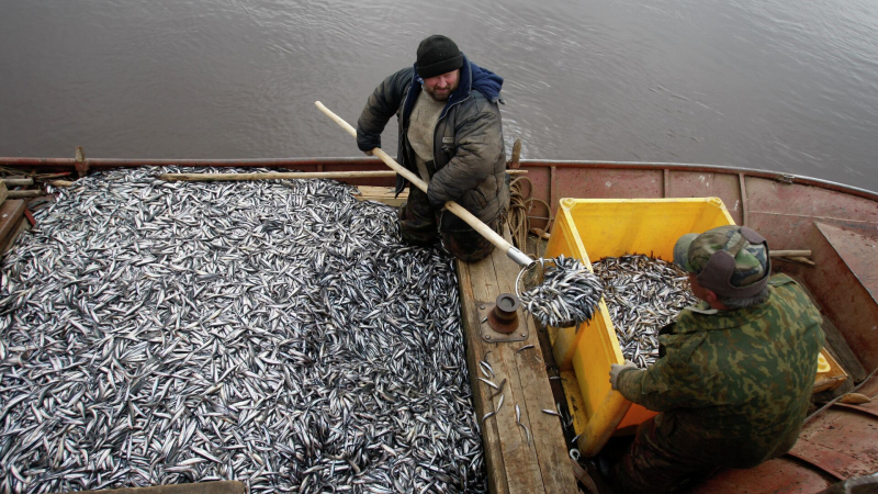 Рыбаки перегружают выловленную корюшку в ящик для дальнейшей транспортировки. Архивное фото Самыми главными импортерами российской рыбы по итогам…