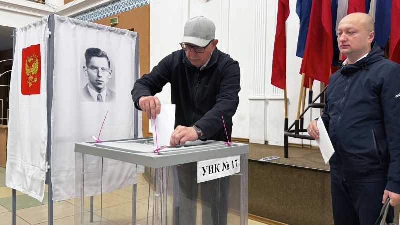 Мужчина голосует на выборах губернатора Еврейской автономной области на избирательном участке в городском дворце культуры в Биробиджане Явка…