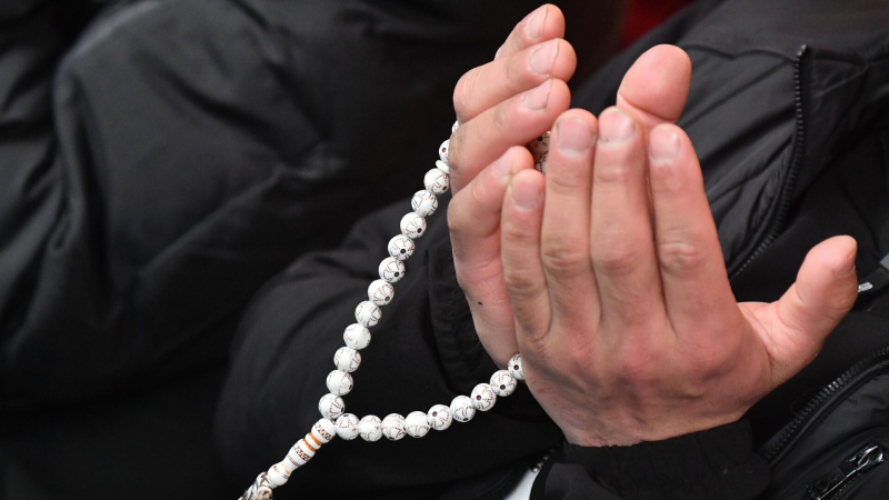 Четки в руках верующего на богослужении в день праздника Ураза-байрам в Московской соборной мечети Пост во время священного…