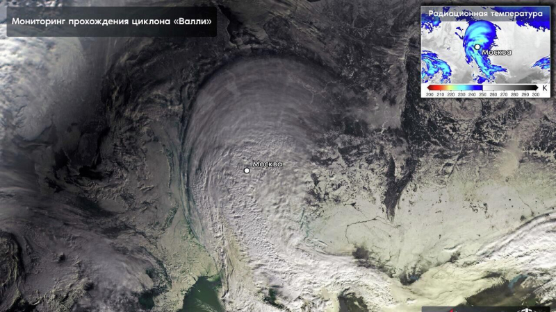 Циклон «Валли» Госкорпорация «Роскосмос» опубликовала в своем Telegram-канале фото циклона «Валли» над Москвой. «Со стороны Болгарии, через Крым…