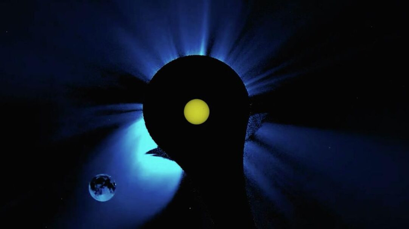 Кадр видео, показывающего прохождение Луны по солнечному диску во время солнечного затмения Комбинированное видео, показывающее прохождение Луны по…