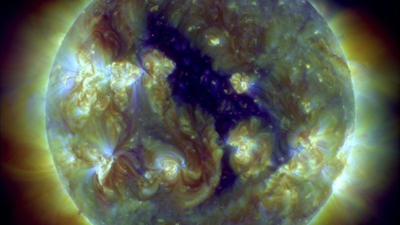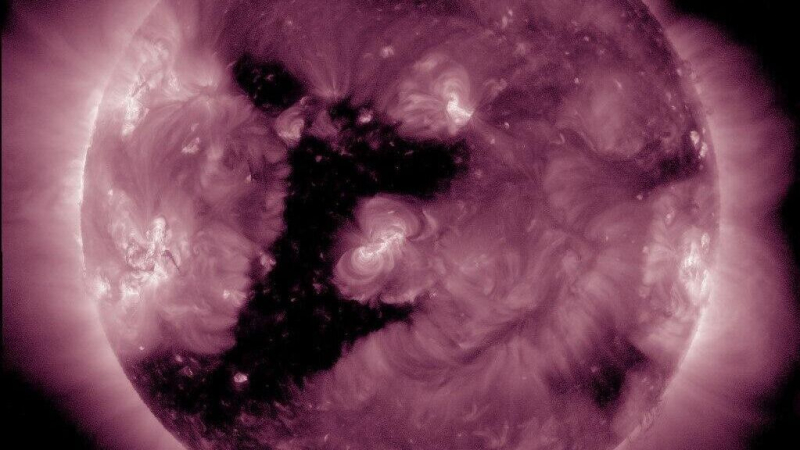Темный силуэт корональной дыры на Солнце. Архивное фото Уменьшение солнечной активности и сокращение активных центров на поверхности звезды,…