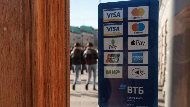 Наклейка с информацией об используемых платежных системах на двери кафе в Санкт-Петербурге. Архивное фото Для удобства российских и…